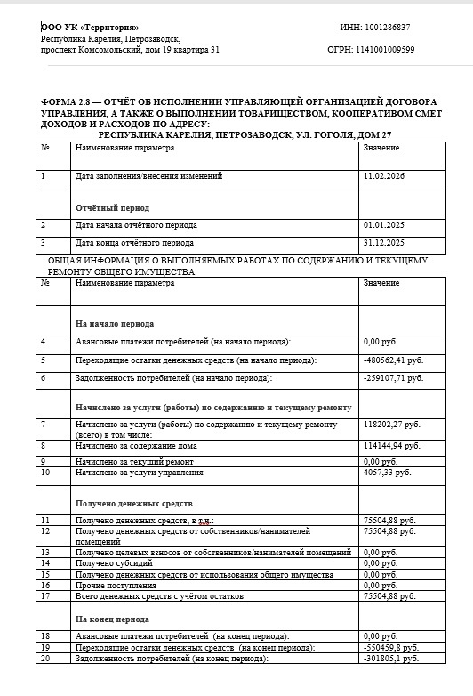 Форма 2.8 — Отчёт об исполнении управляющей организацией договора управления, а так же отчёт о выполнении товариществом, кооперативом смет доходов и расходов за год