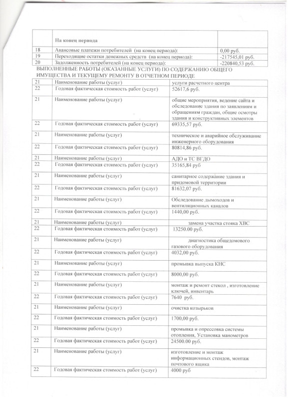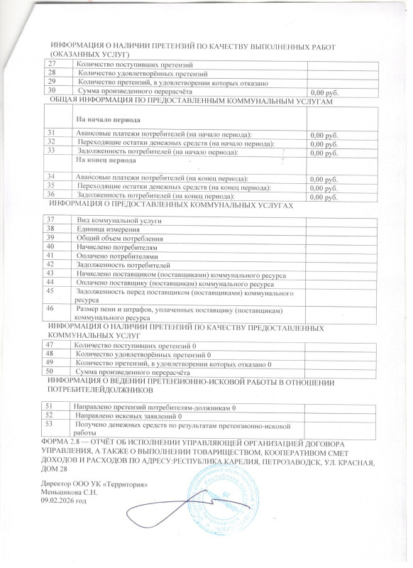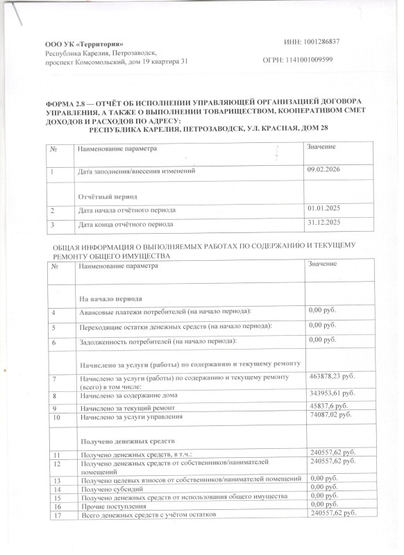 Форма 2.8 — Отчёт об исполнении управляющей организацией договора управления, а так же отчёт о выполнении товариществом, кооперативом смет доходов и расходов за год