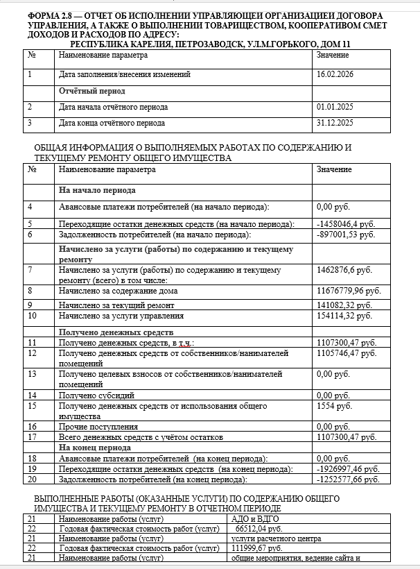 Форма 2.8 — Отчёт об исполнении управляющей организацией договора управления, а так же отчёт о выполнении товариществом, кооперативом смет доходов и расходов за год